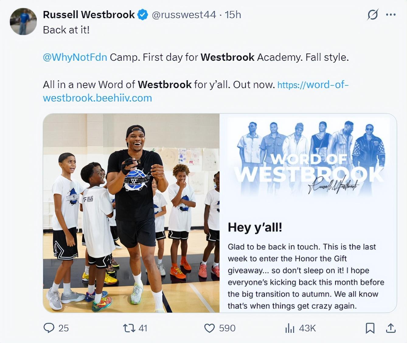 北京时间8月22日,拉塞尔-威斯布鲁克在个人社媒上发布了训练营开班的消息,威少还为训练营的学员们创造了一首歌曲,从图片中我们看看到威少的右手还是绑着厚厚的护具。