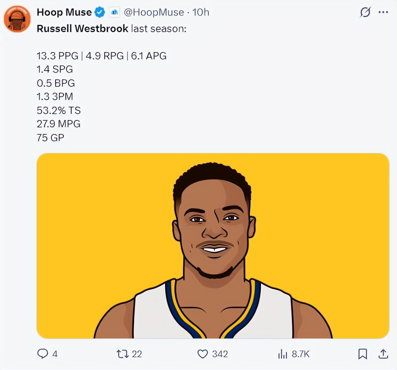36岁的威少上赛季场均27.9分钟,打了75场比赛拿到13.3分4.9篮板6.1助攻1.4抢断0.5盖帽,真实命中率53.2%,说实话威少表现很不错,但没想到他跳出合同后一直都没有球队跟他签约。