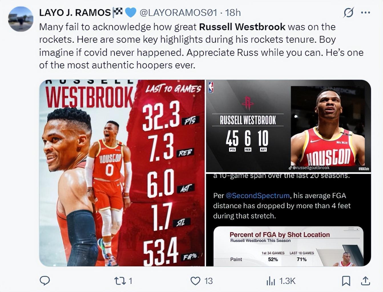 休媒写道:很多人都不清楚威少当年在休斯顿是多么出色,想象一下如果没有泡泡赛区的话会是什么样,他是有史以来最真实的运动员之一,好好珍惜他吧。