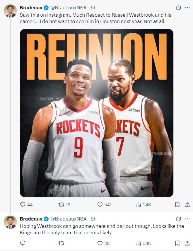 随后有休斯顿媒体为威少辩护,但火箭记者Bradeux发声:我在INS上看到这条消息,有人希望威少与杜兰特第二次合作。我向威少的生涯致以崇高的敬意,但我真的不想看到他下赛季在休斯顿打球,一点都不希望看到他与杜兰特再度合体。