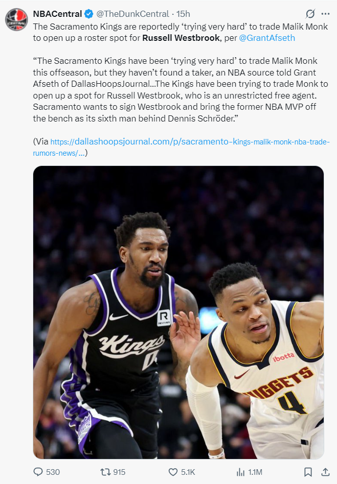 早些时候国王记者透露,休赛期国王一直都在积极兜售马利克-蒙克1800万的合同,国王也一直在与威少联系,一旦国王送走了蒙克,那么国王会立即签下威少,现在就在等待球队的运作。