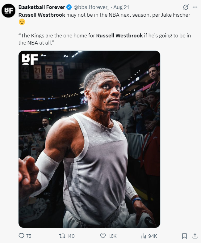一天之前,BR记者杰克-费舍尔也透露,除了国王之外没有任何一支球队有意威少,威少想要留在NBA延续生涯他只能去萨克门托。